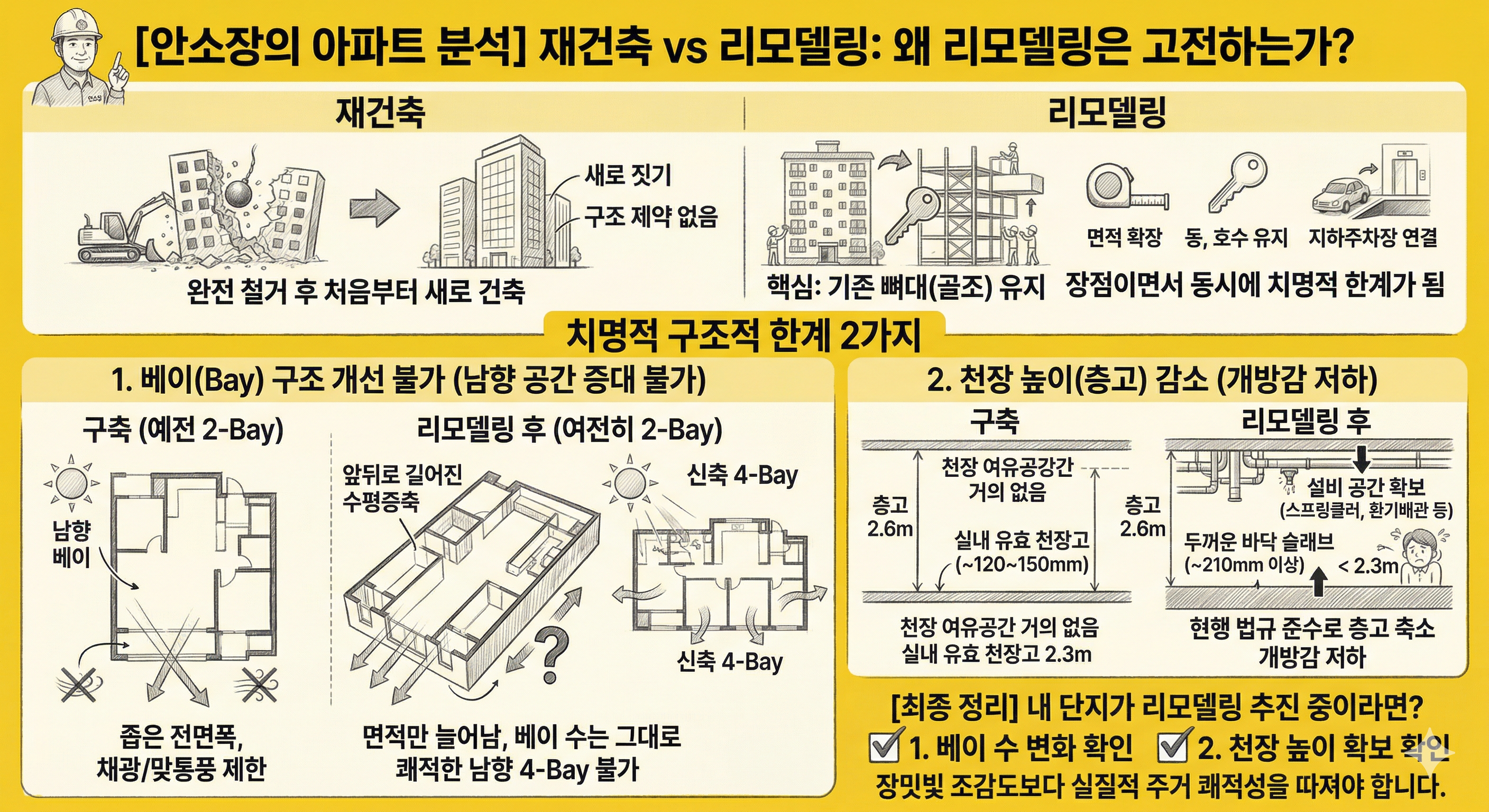 내 단지가 리모델링을 추진 중이라면, 장밋빛 조감도만 보지 마시고 이 2가지를 꼭 따져보시길 권합니다. 베이가 몇 개로 바뀌는지, 천장 높이는 얼마나 확보되는지. 이 두 숫자가 리모델링 후 삶의 질에 큰 영향을 끼칩니다.