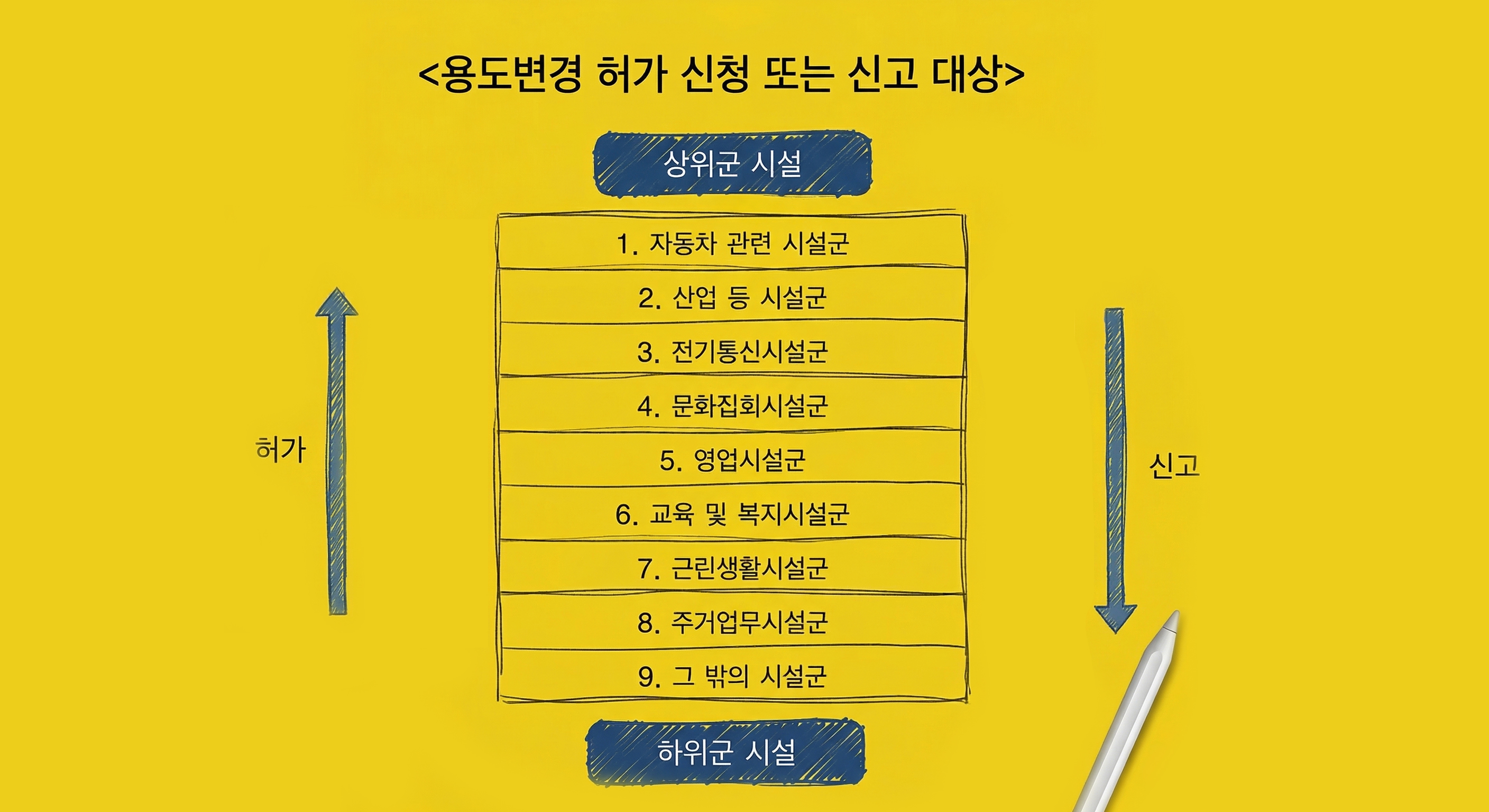 규칙은 간단합니다. 위험도가 높은 시설군에서 낮은 하위 시설군으로 바꾸려고 하면 신고대상, 반대로 위험도가 낮은 시설군에서 높은 시설군으로 바꾸려고 하면 허가대상입니다. 동일한 시설군 내에서는 기재변경 신청 대상입니다.