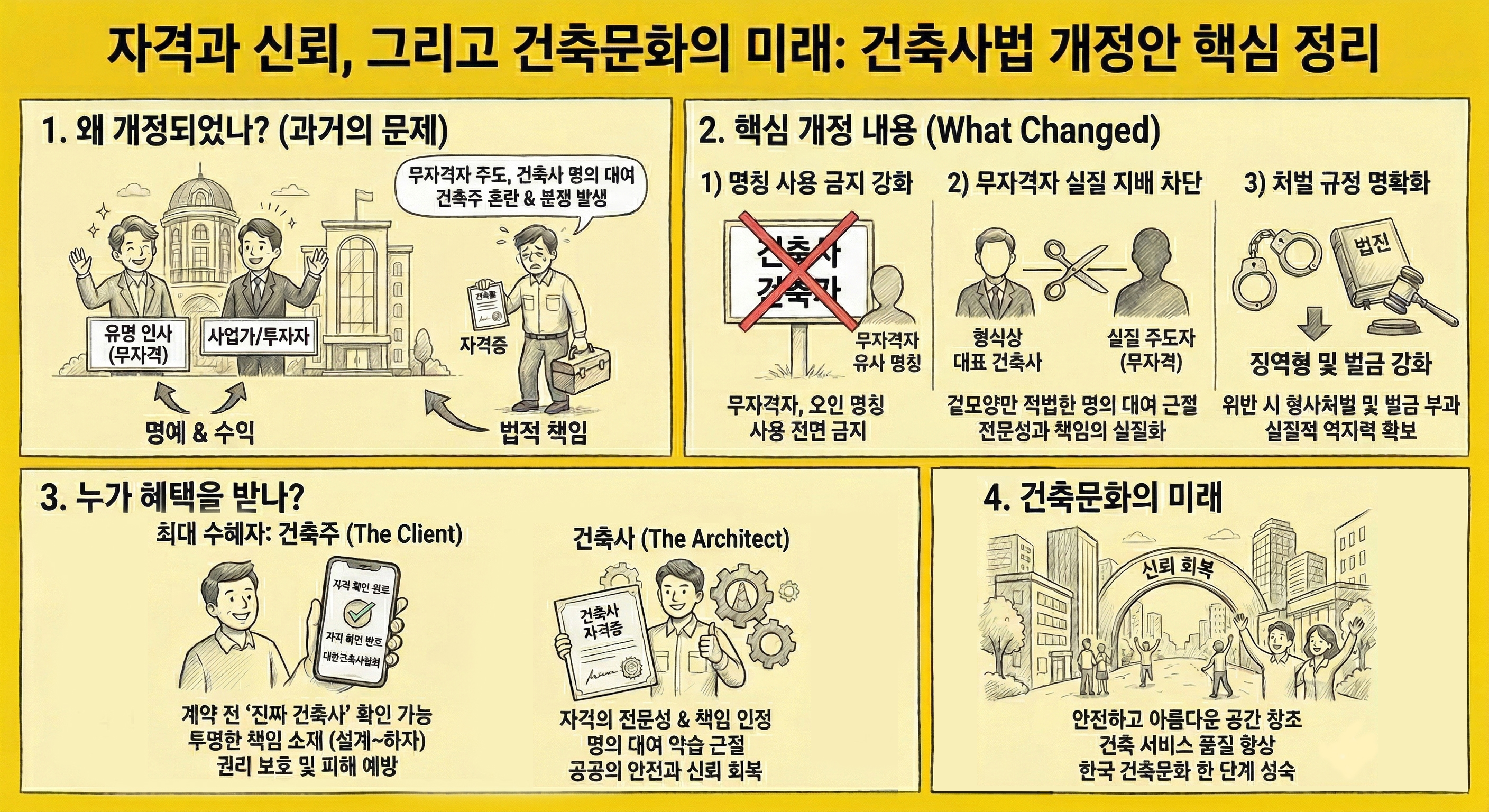 법은 문화를 바꾸는 도구가 될 수 있습니다. 이번 건축사법 개정안이 단순한 규제 강화로 그치지 않고, 건축사와 건축주 사이의 신뢰를 회복하고 건축 서비스의 질을 높이는 계기가 되길 기대합니다.