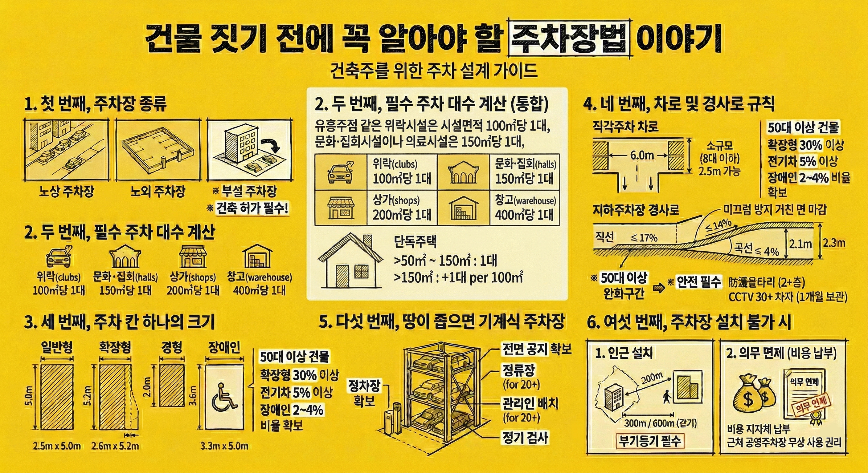 도심에서 주차장은 건물의 크기와 수익성을 결정하는 핵심요소입니다. 건물의 외관이 아무리 멋지고 임대면적을 잘 뽑는다고 해서 전부 반영할 수 있는건 아닙니다. 주차 몇 대를 뽑아낼 수 있느냐에 따라 건물의 연면적과 층수가 달라지고 이는 사업성으로 직결되기 때문입니다. 이번 챕터에서는 건축설계 시 꼭 알고 있어야 할 내용 위주로 짚어 드리겠습니다.